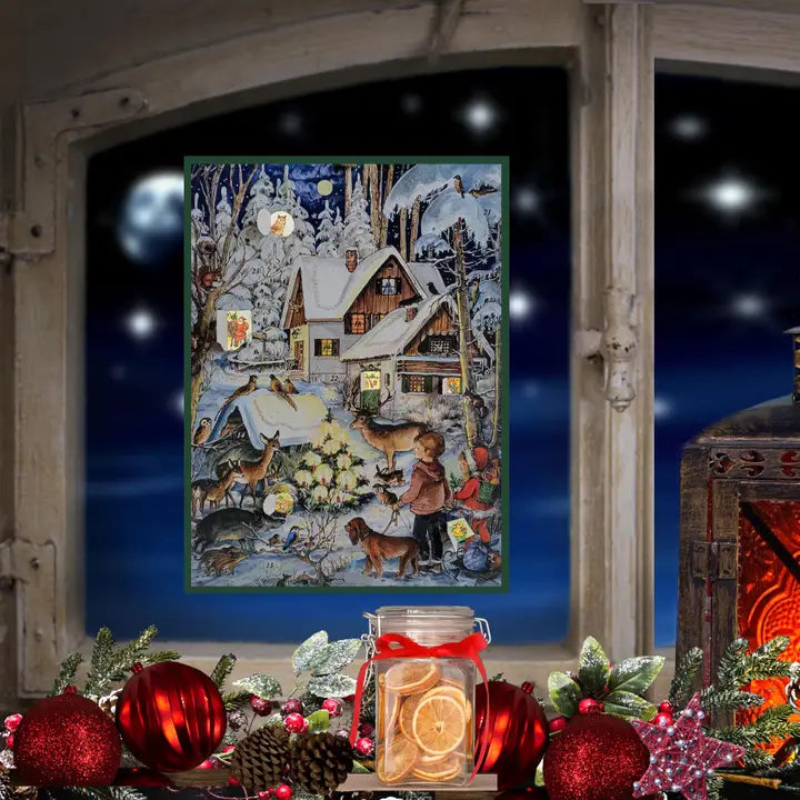 Winterzauber zum Aufhängen - Der nostalgische Adventskalender „Winter bei den Tieren“ erzählt eine kleine, stille Weihnachtsgeschichte: Kinder und Waldtiere treffen sich rund um den leuchtenden Weihnachtsbaum, Geschenke liegen auf dem Schlitten bereit, die Dächer sind tief verschneit.
