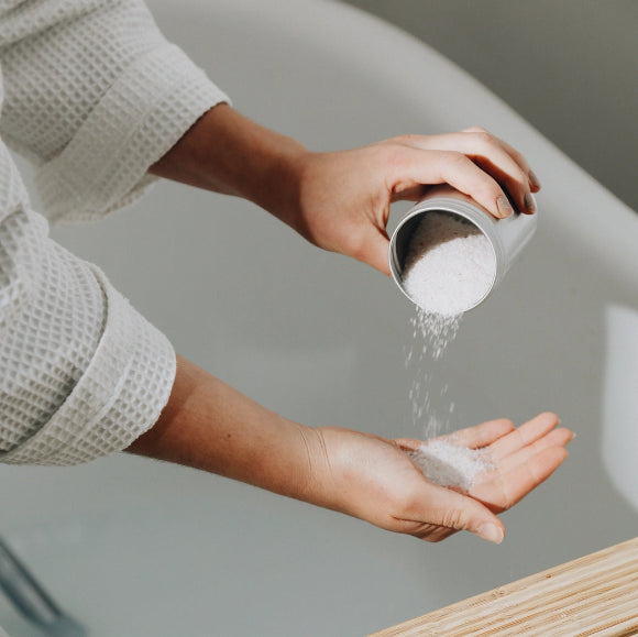 Eine gewünschte Menge ins einlaufende, warme Badewasser geben und auflösen lassen.