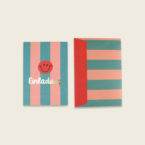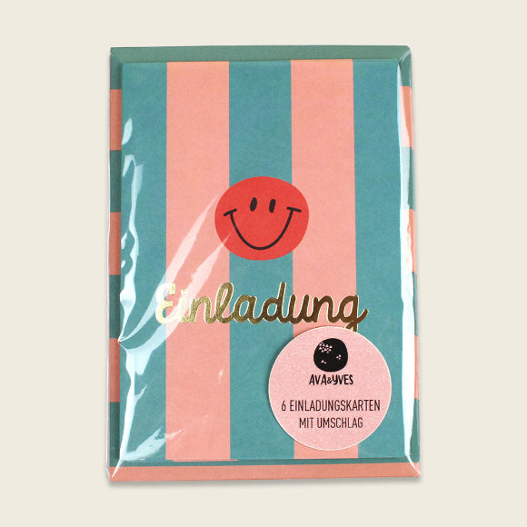Mit diesen fröhlichen Einladungskarten von Ava & Yves wird jede Feier schon beim Einladen zum Highlight! Das frische Streifen-Design in Koralle und Türkis kombiniert mit dem fröhlichen Smiley-Motiv sorgt sofort für gute Laune. Der goldene Prägedruck „Einladung“ macht die Karten besonders edel.