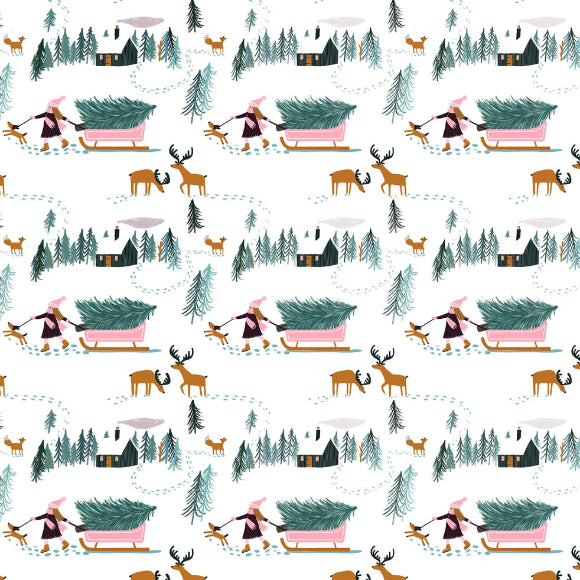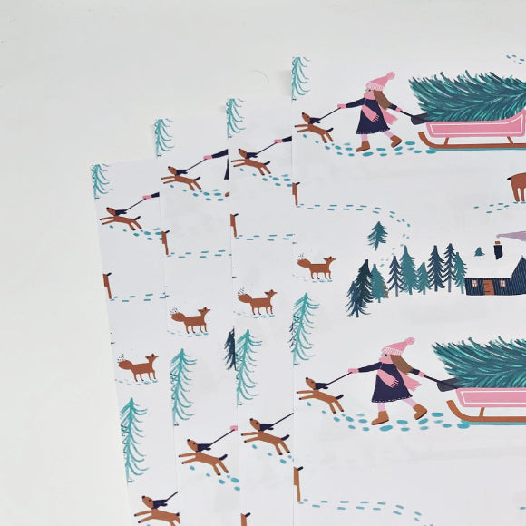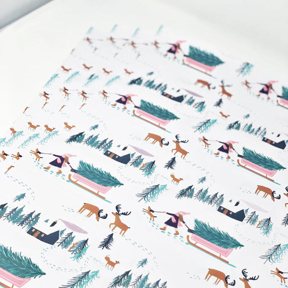 Dieses verspielte Geschenkpapier zeigt eine winterliche Szene mit Schlitten, Tannen und Rehen – wie aus einem Weihnachtsbilderbuch. Perfekt, um Kinder- und Familiengeschenke besonders liebevoll zu verpacken. Das starke, hochwertige Papier lässt sich sauber falten, wird gerollt geliefert und ist vollständig recycelbar. Für alle, die Weihnachten mit einem Augenzwinkern feiern.
