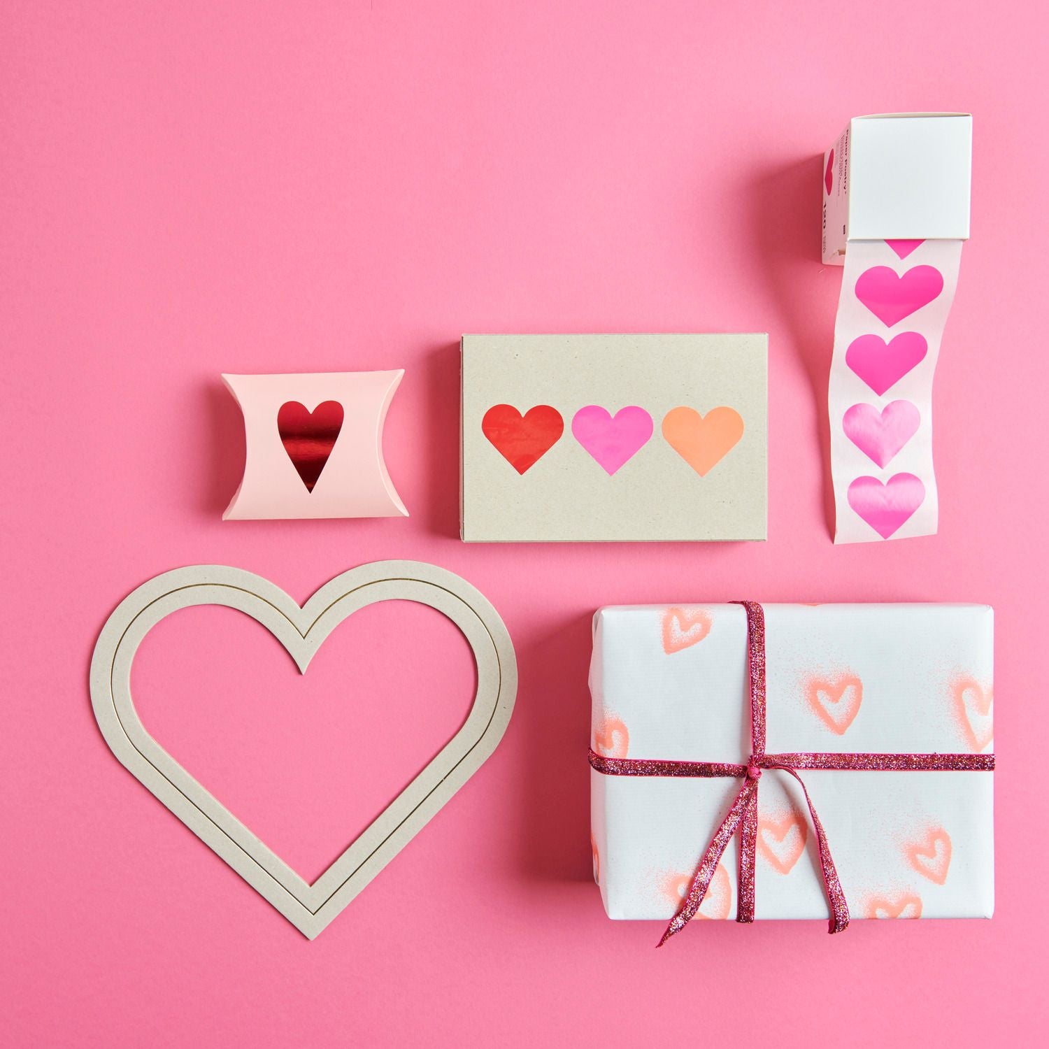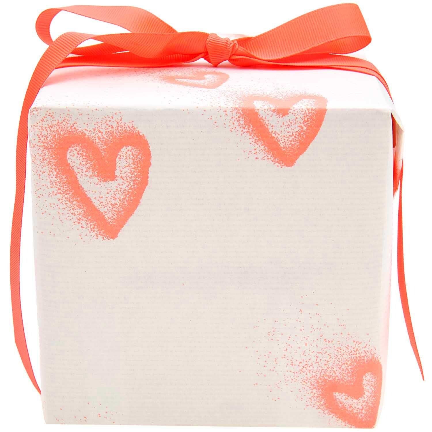 schönes Geschenkpapier mit neonroten Spray-Herzen