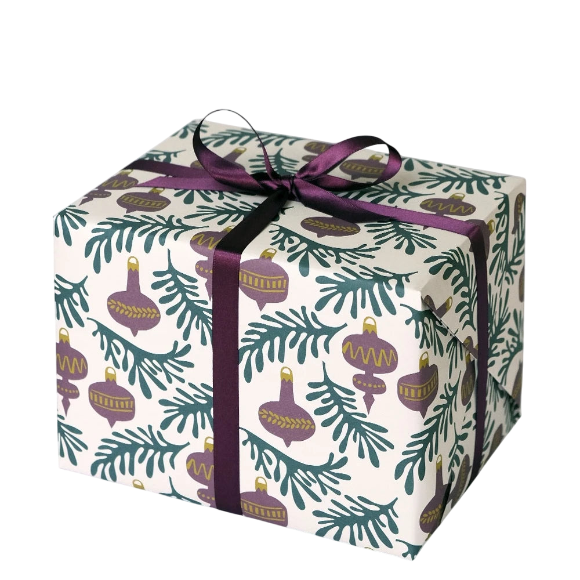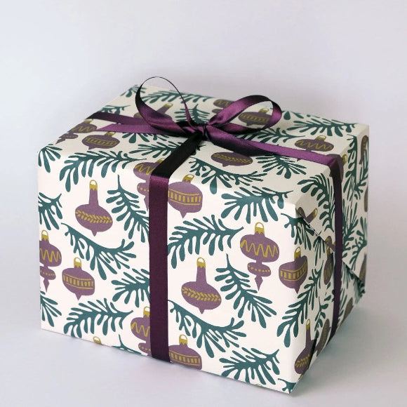 Weihnachtliches Geschenkpapier mit Christbaumkugeln und Zweigen. Produziert in Berlin auf feinem mattem Papier. Dieses Geschenkpapier wurde in Deutschland designed und gedruckt – auf FSC-zertifiziertem Papier. Das Papier lässt sich hervorragend falten.