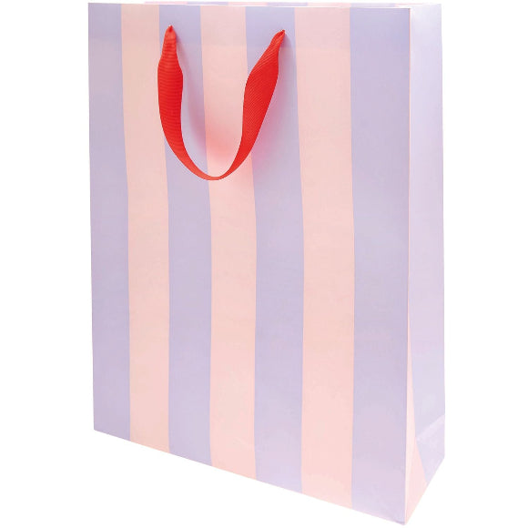 Stilvolle Geschenktasche aus Papier mit breiten Rosa-/Fliederstreifen und rotem Textilband-Griff. Stabil, wiederverwendbar und ideal für Geburtstag, Hochzeit, Babyshower oder kleine Aufmerksamkeiten – Geschenk rein, Seidenpapier dazu, fertig!