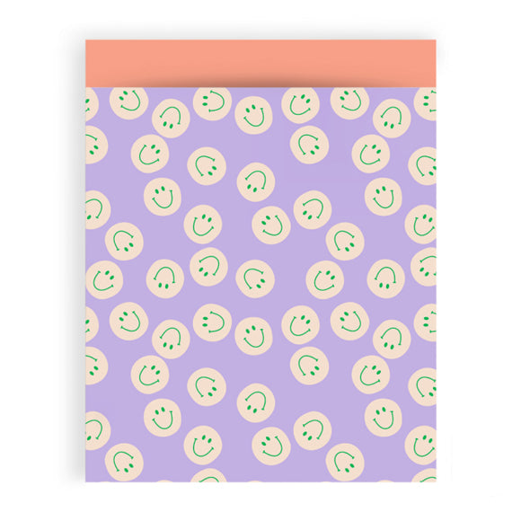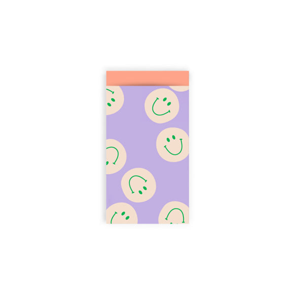 Bringe mit diesen fröhlichen Geschenkbeuteln ein Lächeln in jedes Gesicht! Das pastellorange Smiley-Design auf lila-purpurfarbenem Hintergrund sorgt für gute Laune, während die lachsfarbene Innenseite das verspielte Design abrundet.