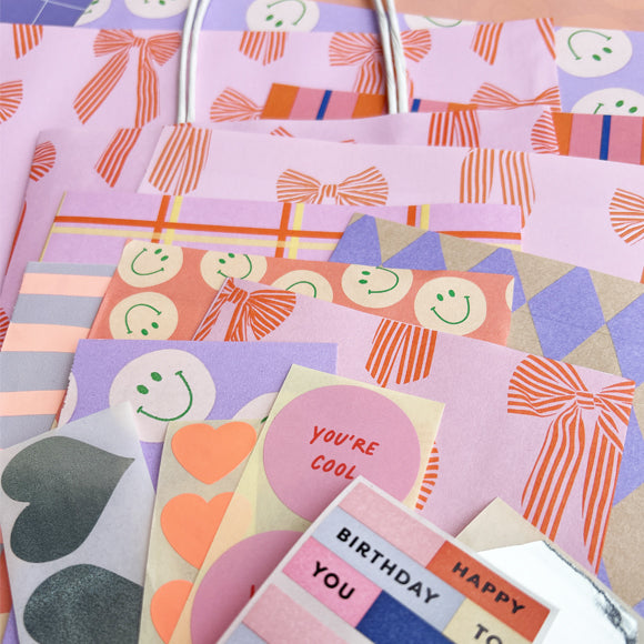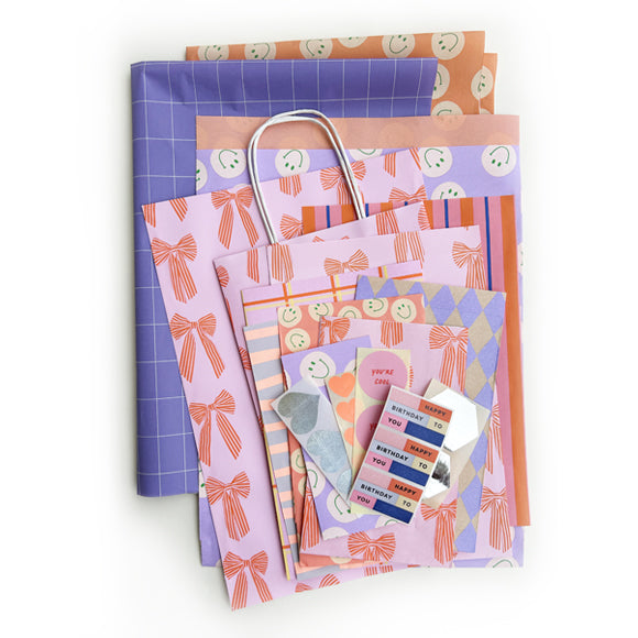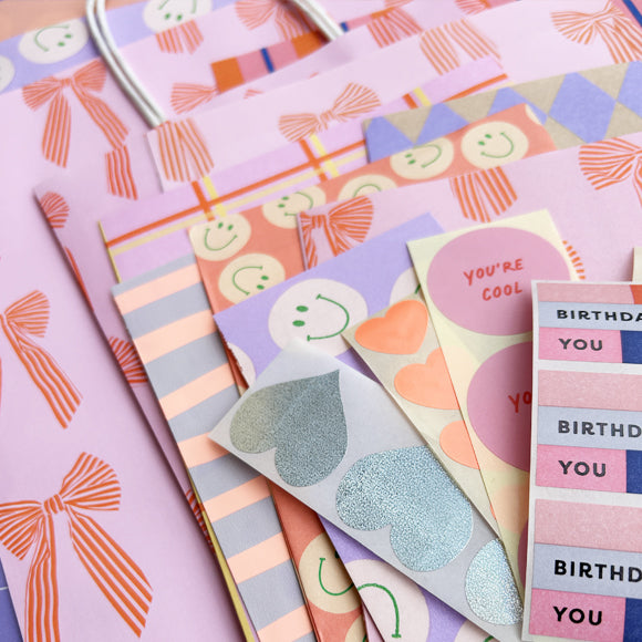 liebevoll zusammengestelltes Geschenkverpackungs-Set aus schicken Flach- und Bodenbeuteln, Tüten, schönem Seidenpapier und coolen Stickern