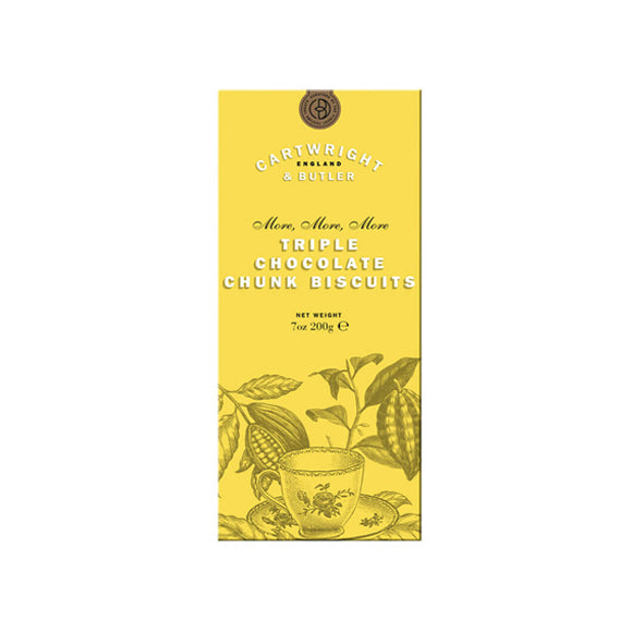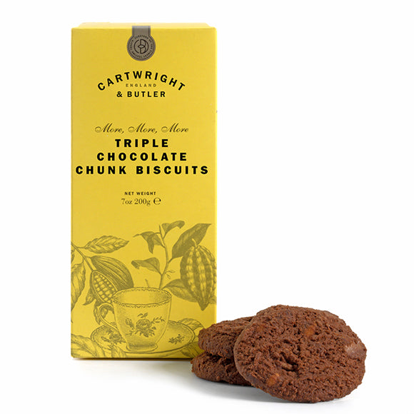 Ein Traum für Schokoladenliebhaber: Die Triple Chocolate Chunk Biscuits von Cartwright & Butler vereinen zartes Mürbeteiggebäck mit großzügigen Stücken aus dunkler, Vollmilch- und weißer Schokolade. Knusprig, buttrig, intensiv schokoladig – ein Genussmoment zum Tee, Kaffee oder einfach zwischendurch. Verpackt in der stilvollen Dose – auch perfekt zum Verschenken!