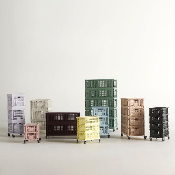 Es gibt die Crates in verschiedenen Größen und in einer Vielzahl von bunten Tönen, die sich zu wunderschönen Farbpaletten kombinieren lassen. Colour Crates sind stapelbar. Wenn sie nicht verwendet werden, lassen sie sich leicht zusammenfalten und nehmen wenig Platz in Anspruch.