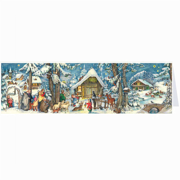 Ein sehr detailgetreuer Adventskalender mit einer Länge von 30 Zentimeter. Er kann entweder aufgestellt werden, oder auch an die Wand gehängt werden. Auf diesem Adventskalender gibt es viel zu entdecken . Viele Tiere und Kinder umranden das Geschehen vor dem Stall. Was mag sich darin wohl befinden ? Ein Highlight ist die wunderschön verschneite Naturlandschaft. Jedes Jahr wieder ein sehr beliebter Adventskalender.