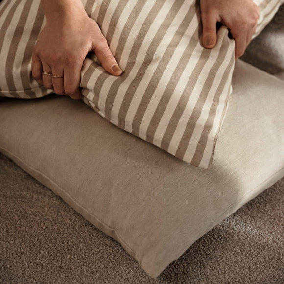 Das Strand-Außenkissen ist der perfekte Begleiter für deinen Außenbereich – es fügt sich einwandfrei in seine Umgebung ein und sorgt für zusätzliche Eleganz und Komfort. Dieses elegante Kissen aus wasserabweisend beschichteter, garngefärbter Bio-Baumwolle mit einer Füllung aus recyceltem Polyester hält auch leichten Regenschauern stand. Bitte tauche das Strand-Außenkissen aber nicht für längere Zeit in Wasser.