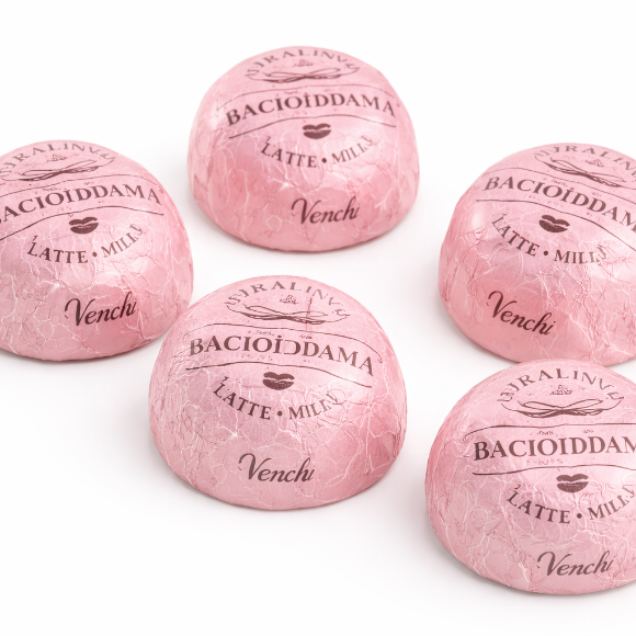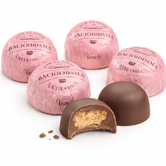 Raffinierte Drei-Schichten Praline mit einem Kern von Biskuit aus Piemonteser Haselnuss IGP, einer Schicht Vollmilchgianduia, die wiederum von einer Vollmilchschokolade umhüllt ist. Baci di Dama einmal umgekehrt.