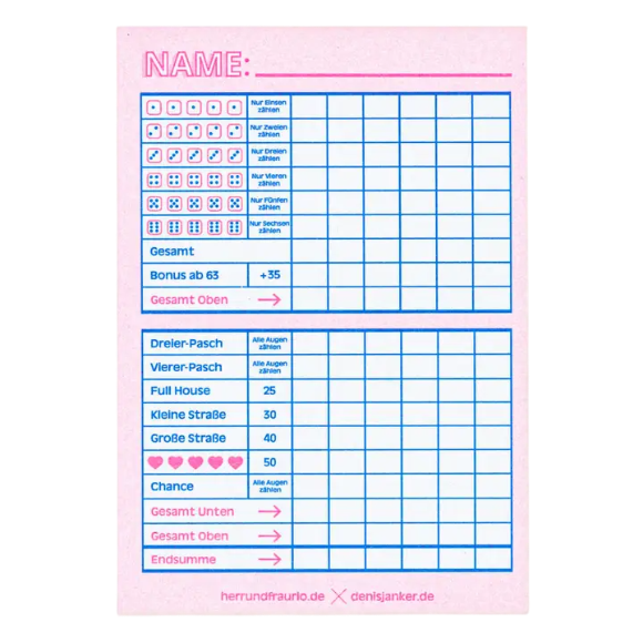 Spielblock - Kniffel- oder Yazzy-Block Pink
