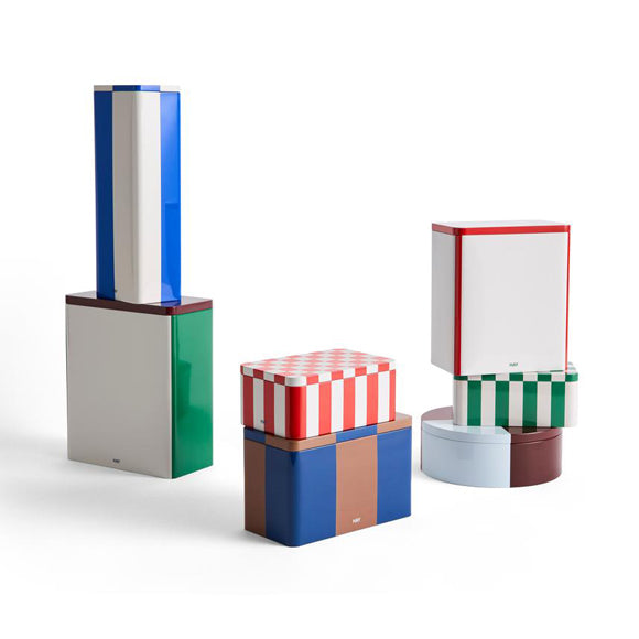 Die Tin Containers von HAY sind eine Kollektion funktionaler und dekorativer Aufbewahrungsboxen mit farbenfrohen Karomustern und einer glänzenden Oberfläche. Der Deckel und der Behälter sind nahtlos aufeinander abgestimmt, wodurch ein elegantes, nahtloses Erscheinungsbild entsteht und gleichzeitig ein luftdichter Sitz gewährleistet wird, der für die Lagerung trockener Lebensmittel geeignet ist. Der Blechbehälter ist in einer großen Auswahl an Größen, Formen und Designs erhältlich und kann dekorativ auf Regalen oder Tischen im ganzen Haus platziert werden, um verschiedene Gegenstände aufzubewahren und zu organisieren.