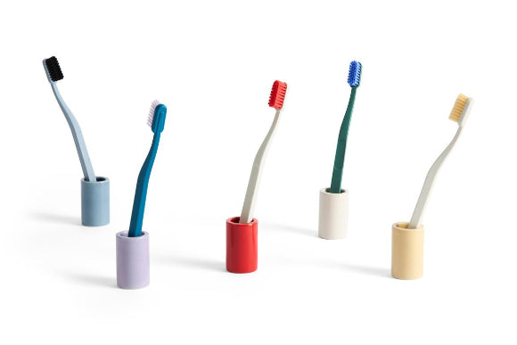 Der Zahnbürstenhalter von Hay bringt Farbe ins Badezimmer. In dem funktionalen und gleichzeitig stilvollen Behälter aus Steingut lassen sich Zahnbürsten optimal aufbewahren und geschmackvoll präsentieren, wie zum Beispiel die Bambus Zahnbürste des Designers Leon Ronsmeier.